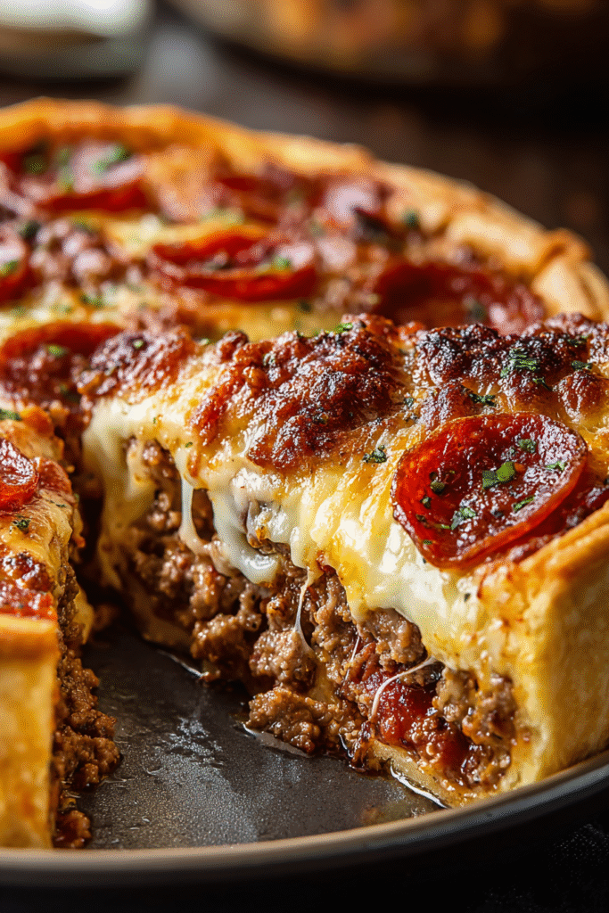 Deep Hamburger Beef Sausage & Pepperoni Pie is a hearty, flavor-packed comfort dish that combines