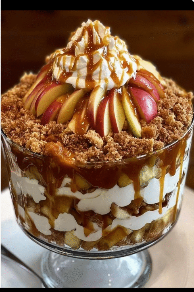 This stunning Caramel Apple Trifle combines layers of tender pound cake, creamy vanilla pudding, spiced
