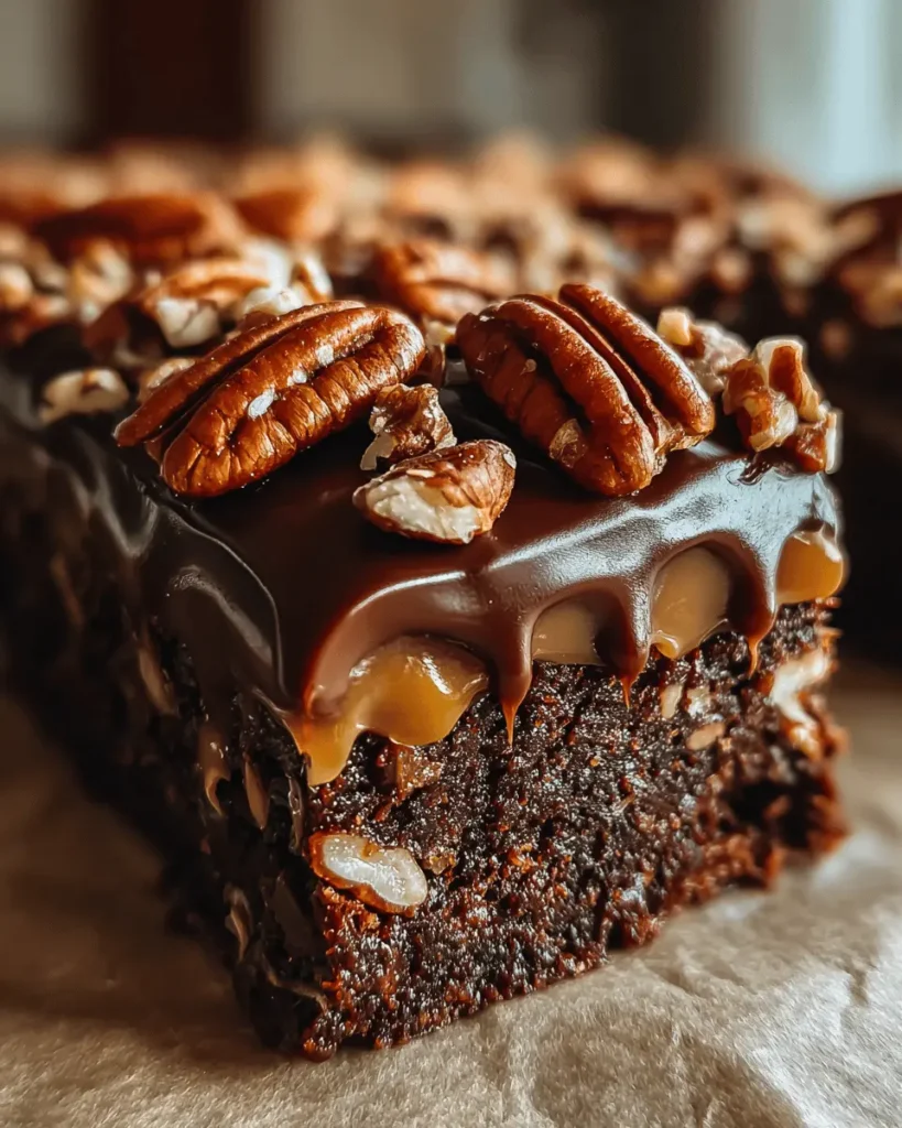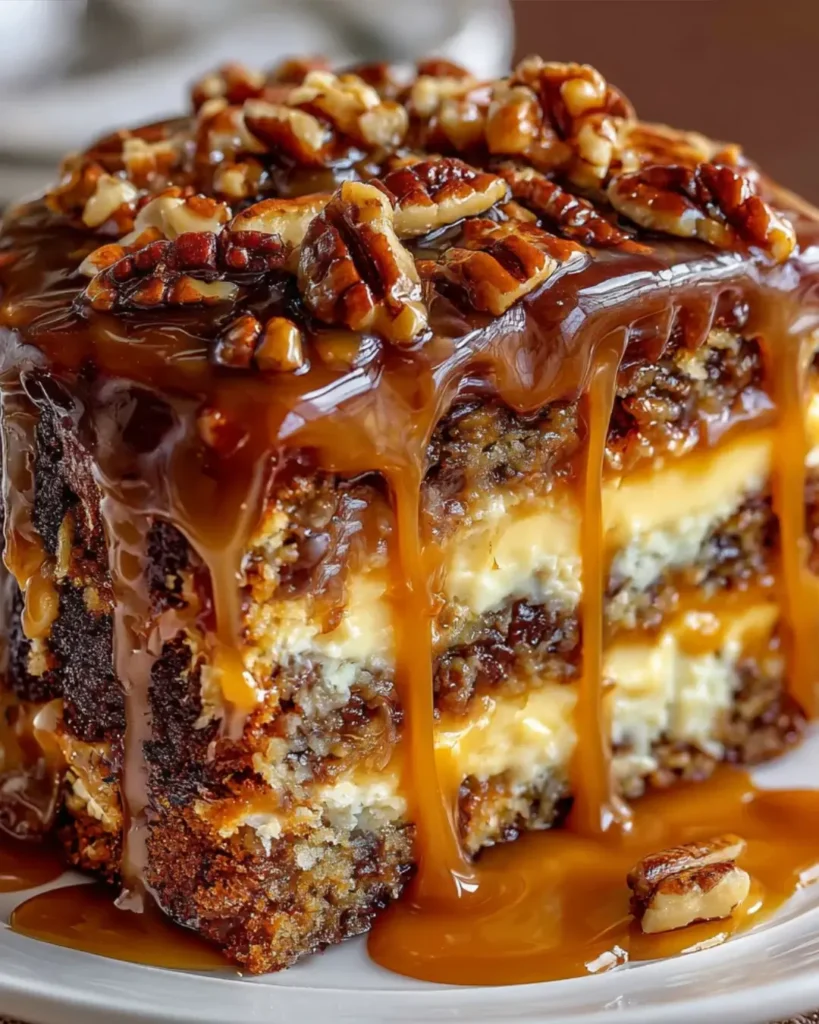 This decadent dessert captures the essence of the beloved Turtle candy in cake form, featuring