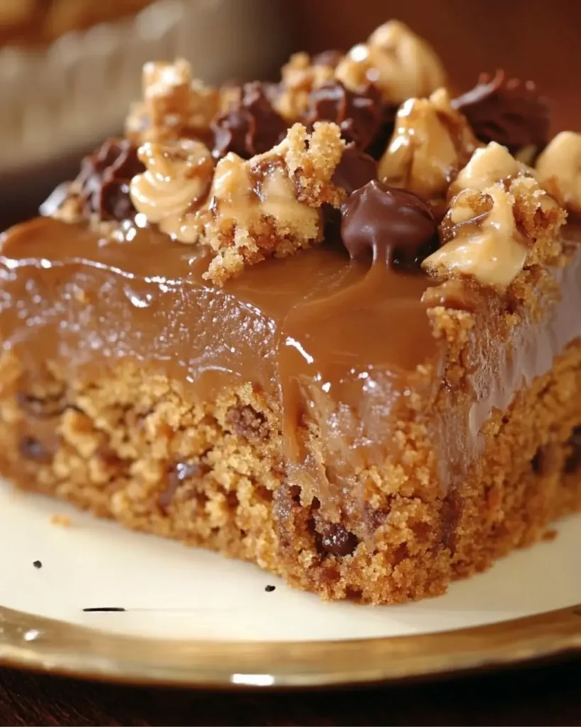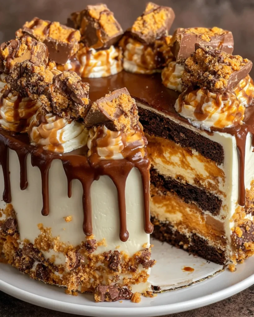 This decadent dessert is a show-stopping fusion of rich chocolate cake, creamy peanut butter mousse, and the irresistible crunch of crushed candy bars. It starts with a moist, cocoa-based sponge cake that is layered with a fluffy, peanut butter-infused whipped cream filling. Finished with a glossy coat of chocolate frosting