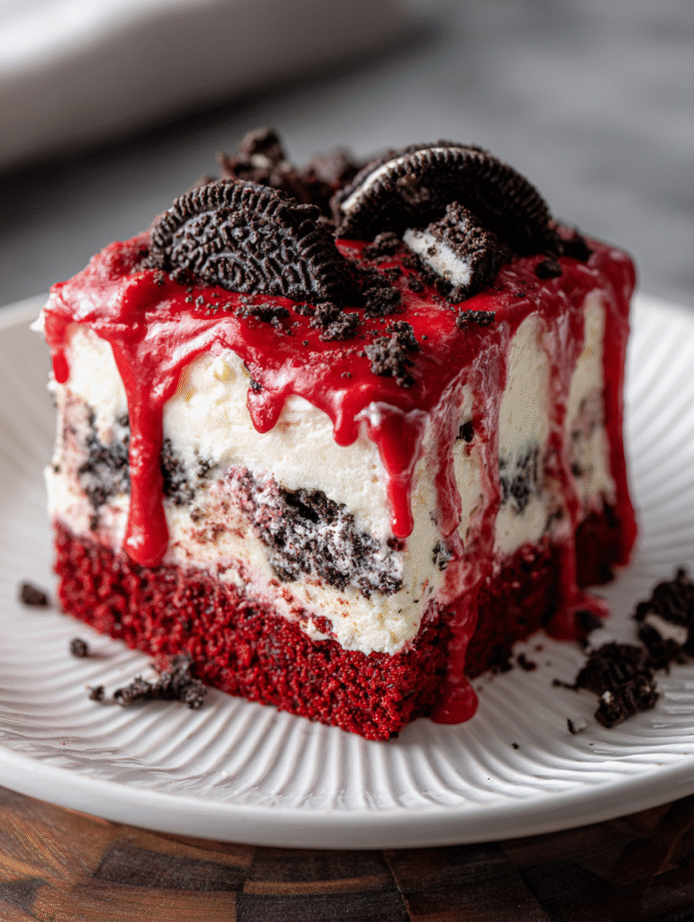 This Red Velvet Poke Cake transforms simple box cake mix into decadent dessert by poking holes throughout baked cake and filling with sweetened condensed milk-cream cheese sauce, then topping with light, fluffy cream cheese frosting for triple-layer indulgence. The recipe builds moisture and flavor through strategic hole-poking that allows creamy