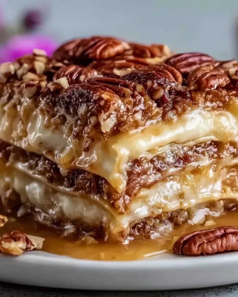This Pecan Pie Lasagna combines graham cracker crust with cream cheese layer and pecan pie