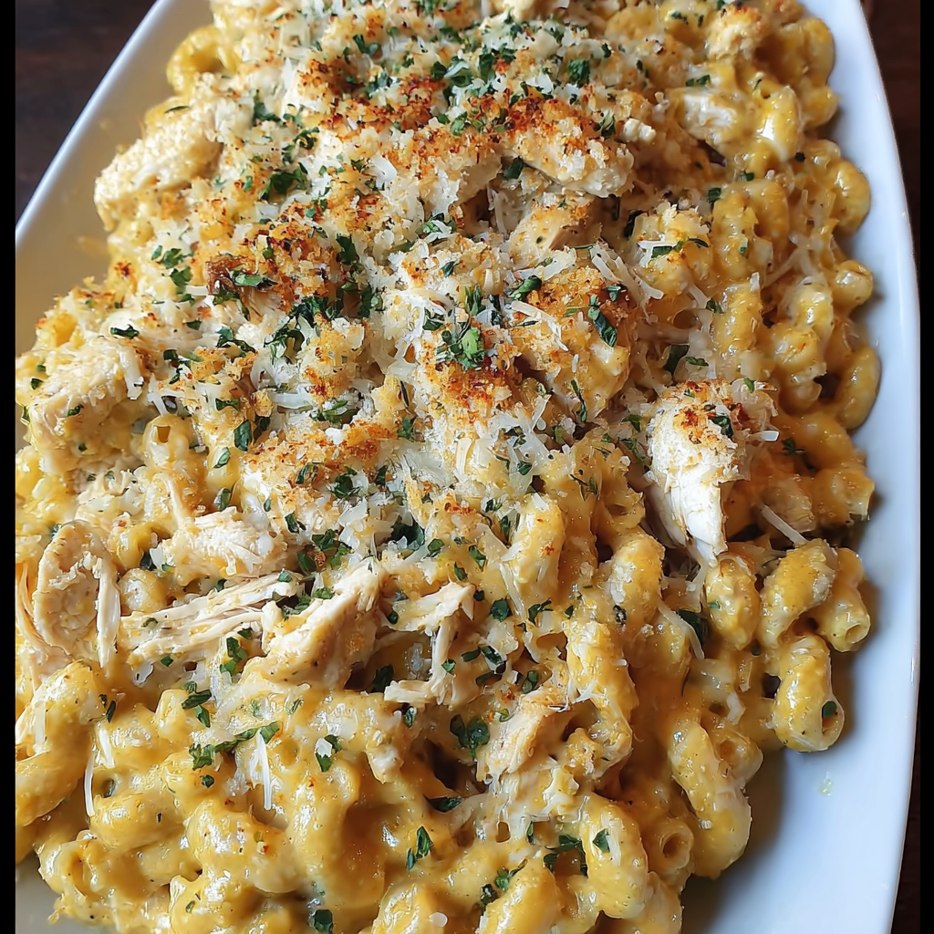 This Parmesan Garlic Chicken Mac and Cheese combines slow-cooked chicken with macaroni in a creamy
