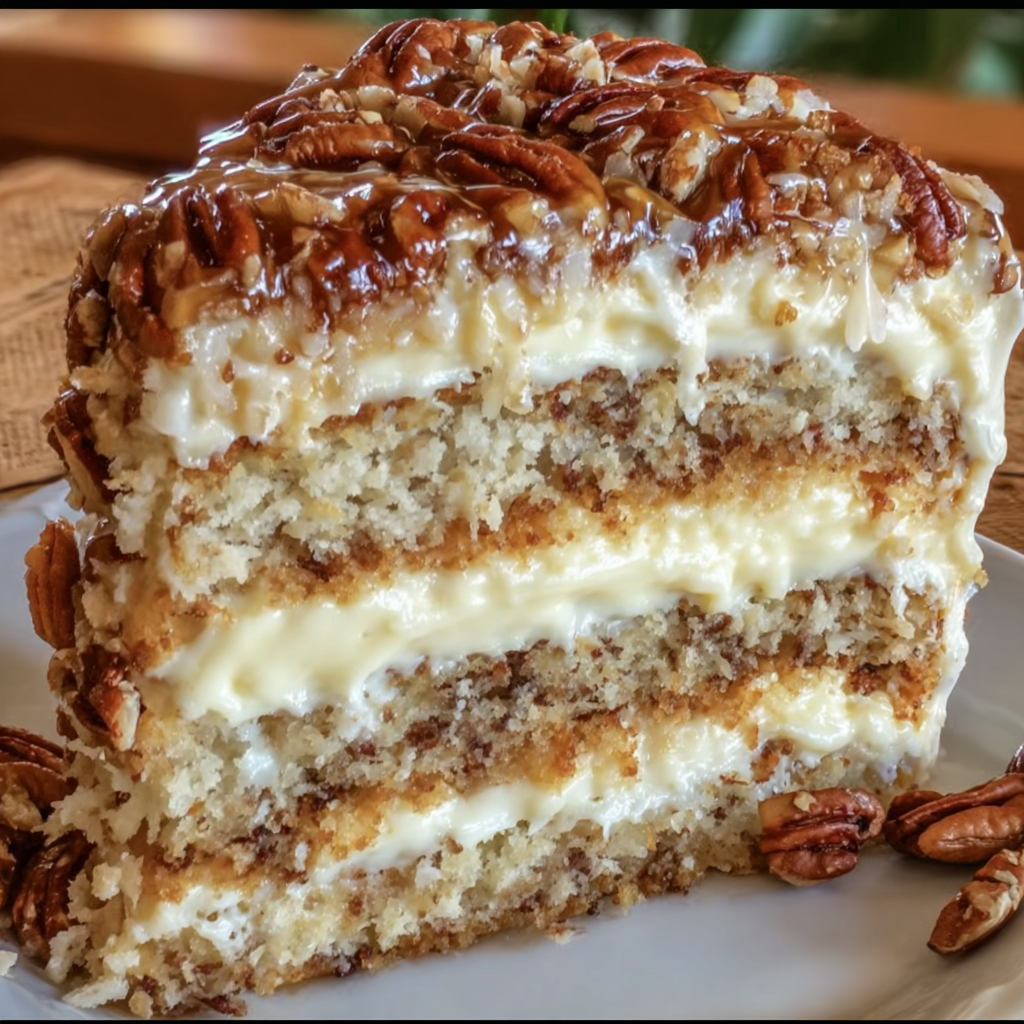 This White German Chocolate Cake with Cheesecake Center features a creamy cheesecake layer sandwiched between
