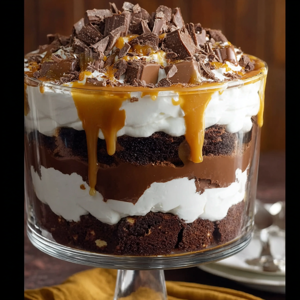 This Chocolate Caramel Brownie Trifle layers brownie bites with chocolate pudding, caramel sauce, and whipped