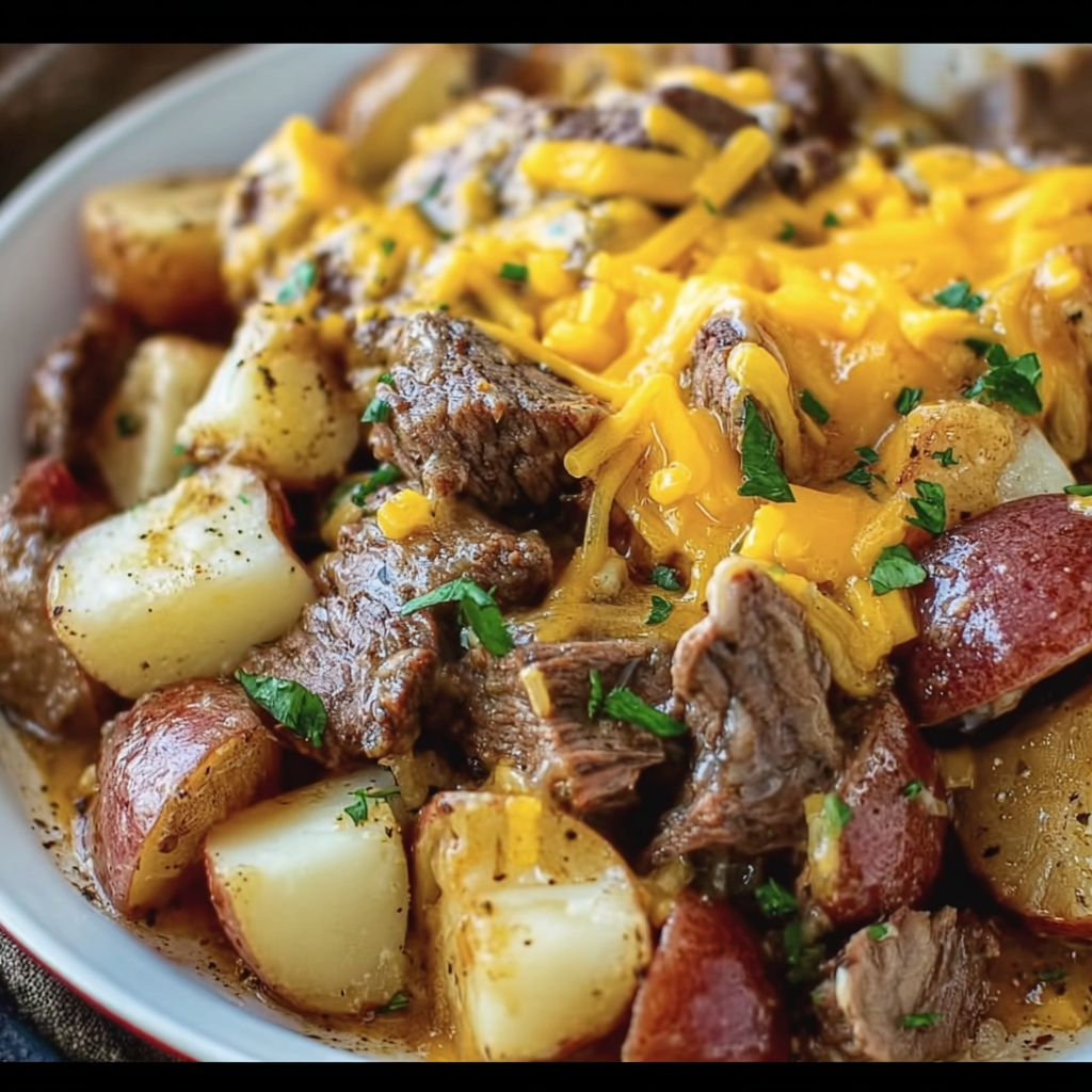 This Crockpot Loaded Steak and Potato Bake combines cubed sirloin steak with diced potatoes, onions,