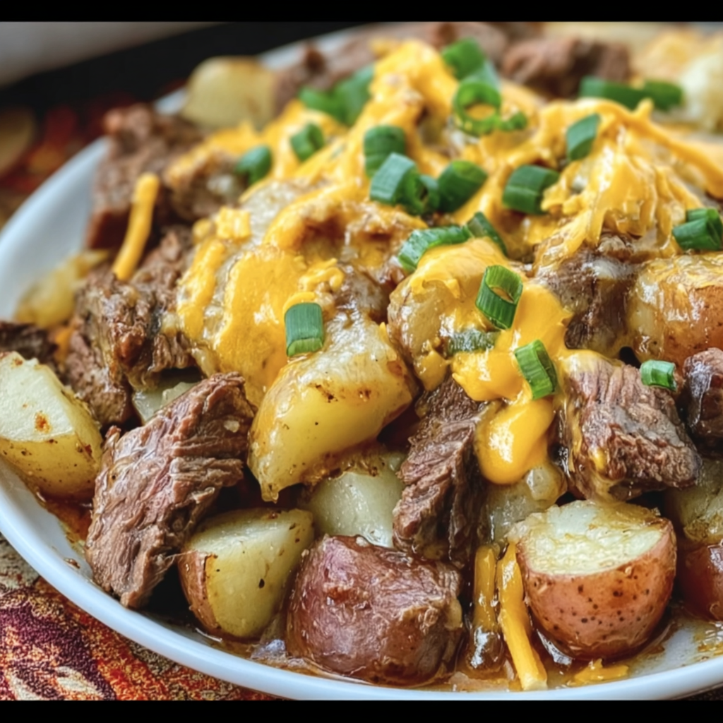 This Crockpot Loaded Steak and Potato Bake combines cubed sirloin steak with diced potatoes, onions, and melted cheddar cheese in a slow cooker for a hands-off comfort food dinner. The recipe creates a one-pot meal by layering seasoned ingredients in the crockpot, adding beef broth and Worcestershire sauce, then slow-cooking until tender before topping with cheese. The technique relies on low-and-slow cooking to tenderize steak and cook potatoes in flavorful liquid.