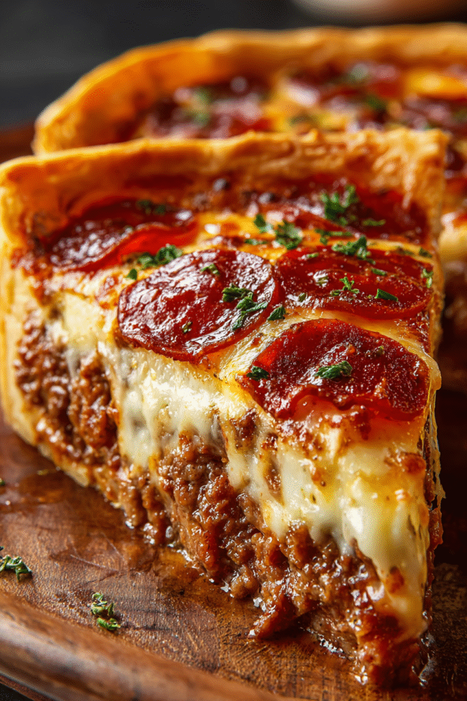The combination of beef and sausage builds deep, savory flavor while tomato paste thickens the sauce to prevent a watery filling. Layering cheese between meat layers ensures even melt and structural stability. A chilled, butter-based crust creates flaky layers that hold up to the hearty filling, making each slice rich, structured, and satisfying.