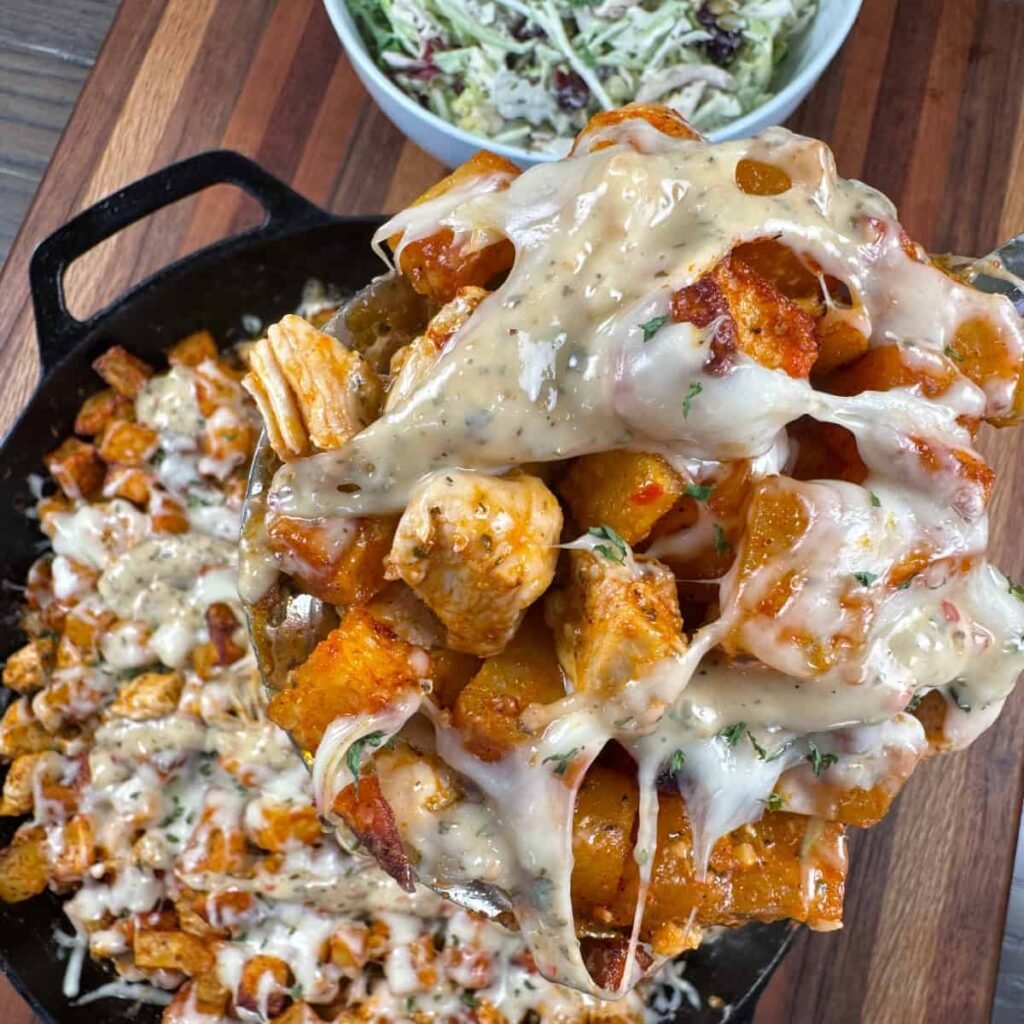 This recipe succeeds by combining high-heat crisping with layered seasoning. Air frying removes surface moisture from the potatoes, allowing starches to crisp effectively. Butter enhances browning on the chicken, while dry spices bloom in fat for deeper flavor. Adding garlic at the end preserves its aromatic compounds without scorching. The Garlic Parmesan sauce delivers emulsified richness that coats both chicken and potatoes, while mozzarella melts to bind everything together. With an estimated 550–650 calories per serving, this dish offers a balanced combination of protein, carbohydrates, and fats suitable for an active family meal.