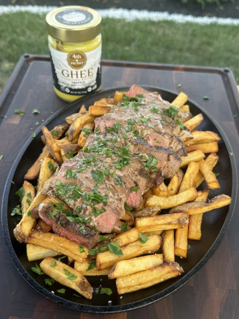 Grilled Ribeye Steak Fries with Creamy Black Truffle Ghee Sauce is a bold, indulgent meal that elevates classic steak and potatoes to gourmet status. Rich yet balanced, it’s perfect for special occasions or when you simply want to impress. For a lighter approach, reduce cream slightly or serve with a larger portion of grilled vegetables to balance the richness while preserving that luxurious flavor.