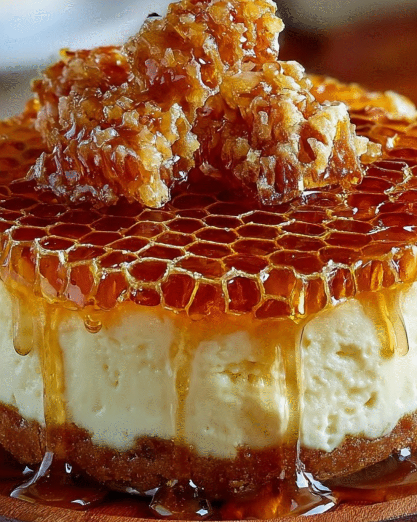 This elegant dessert features a buttery, crisp graham cracker crust filled with a cloud-like mousse of cream cheese and whipped cream, sweetened naturally with golden honey. The result is a sophisticated treat that balances the floral notes of honey with the tangy richness of cheesecake, all topped with crunchy honeycomb shards for a stunning presentation.