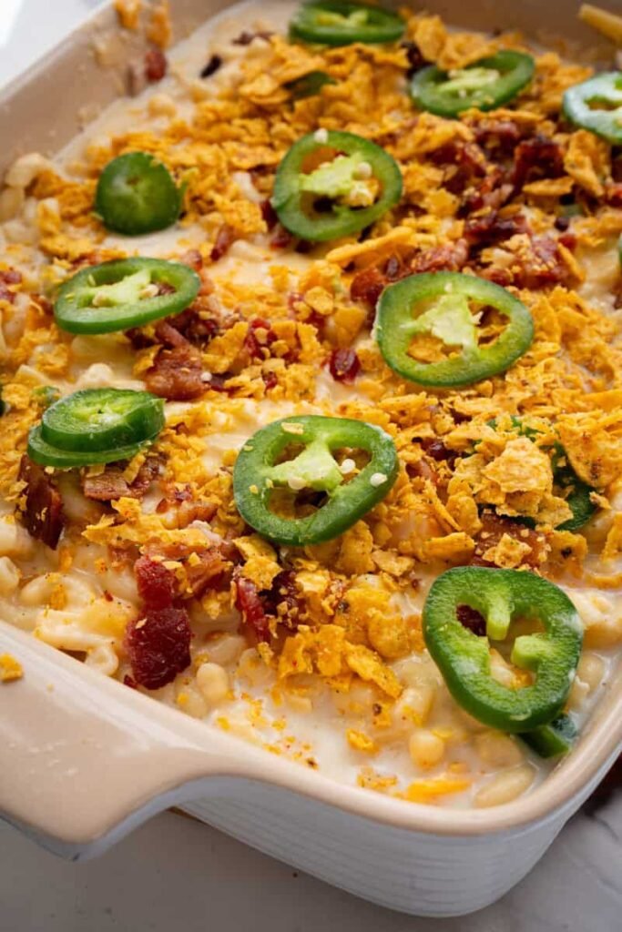 Add the Toppings Arrange the thinly sliced jalapeño circles decoratively over the top of the mac and cheese. Sprinkle the reserved crumbled bacon evenly across the surface, then scatter the crushed Cool Ranch Doritos over everything. Finish by sprinkling the tablespoon of BBQ rub over the entire top for seasoning and color.