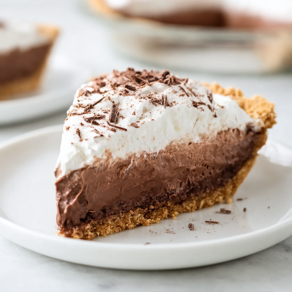 No-Bake Chocolate Pudding Pie succeeds through its strategic layering that creates visual interest and textural variety from minimal ingredients. Instant pudding sets without heating through modified food starch that thickens when mixed with cold milk, creating stable structure that supports additional layers. Dividing the pudding creates depth—the straight pudding layer provides intense chocolate flavor, while mixing the second portion with whipped cream lightens the texture and creates contrast. The graham cracker crust provides sweet, slightly crunchy base that remains crisp because the pudding layers don’t add excessive moisture. Whipped cream topping adds lightness that balances the denser pudding layers below while creating attractive presentation. The chocolate shavings provide visual elegance and textural interest against the smooth cream. Chilling sets all layers and allows flavors to meld while firming the structure for clean slicing. At 216 calories per slice, this pie provides reasonable dessert portions that satisfy chocolate cravings without excessive indulgence.