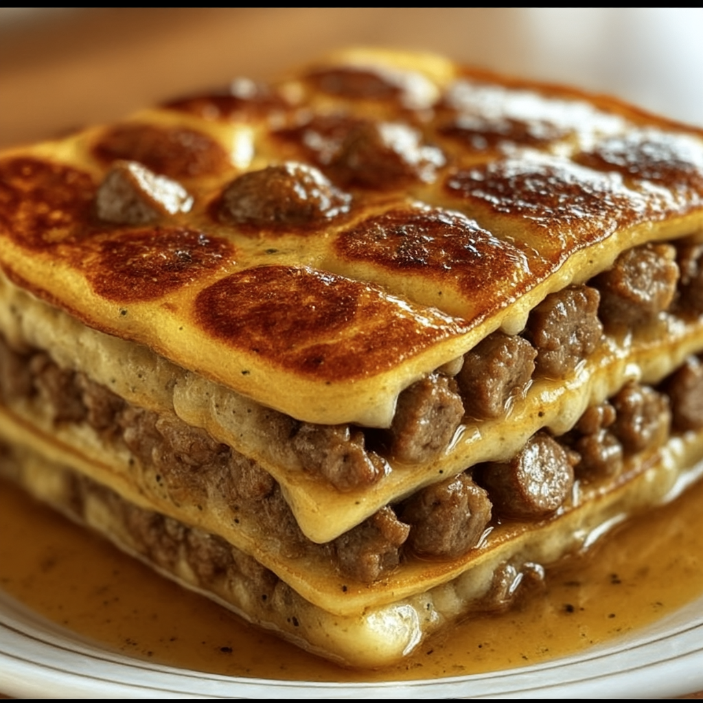 This Pancake Sausage Casserole transforms breakfast into an impressive layered dish that combines fluffy pancakes with savory beef sausage and rich cheese sauce. The recipe creates a stack of pancakes interspersed with seasoned ground beef sausage and creamy cheese layers, then finished with a glossy brown sauce and additional sausage pieces on top. This hearty breakfast casserole is perfect for special occasions when you want to serve something memorable that feeds a crowd.