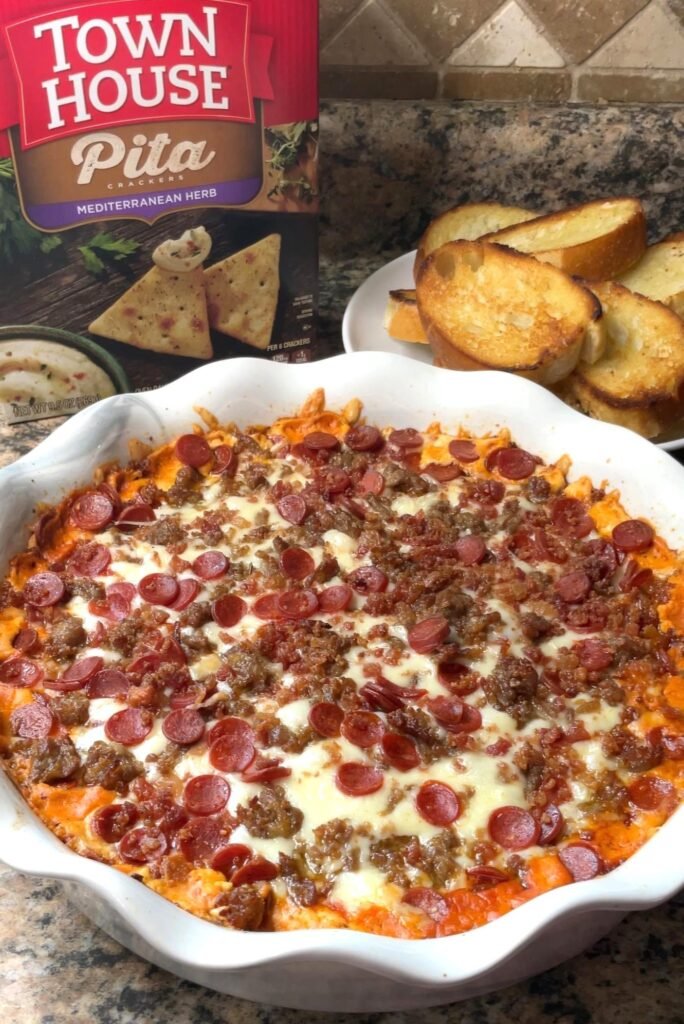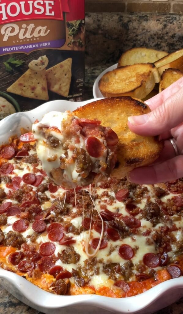 Pizza Dip represents the kind of smart, creative party food that takes beloved flavors from one format and successfully adapts them into another that’s more practical for specific occasions—while pizza is perfect for many situations, a hot, shareable dip works better for standing, mingling, and casual grazing at parties. This recipe has become popular precisely because it solves multiple entertaining challenges: it serves many people from one dish, it appeals universally without being controversial, it can be made ahead to reduce stress, it looks impressive despite being quite simple, and it genuinely tastes delicious rather than being merely convenient. The layered construction creates visual appeal when served while ensuring every scoop gets all the flavors rather than them being uniformly mixed. Whether you’re a frequent host seeking reliable crowd-pleasers, someone responsible for bringing appetizers to gatherings, a pizza enthusiast wanting new ways to enjoy those flavors, or simply appreciate hot, cheesy dips that make people gather around talking and eating, this pizza dip proves that great party food doesn’t require complicated techniques or exotic ingredients but rather smart combinations of familiar favorites presented in formats that encourage sharing, conversation, and the kind of casual enjoyment that makes gatherings memorable—it’s hot, it’s cheesy, it’s loaded with pizza toppings, and it demonstrates that sometimes the best entertaining recipes are the ones that make everyone feel comfortable, satisfied, and happy to be together.