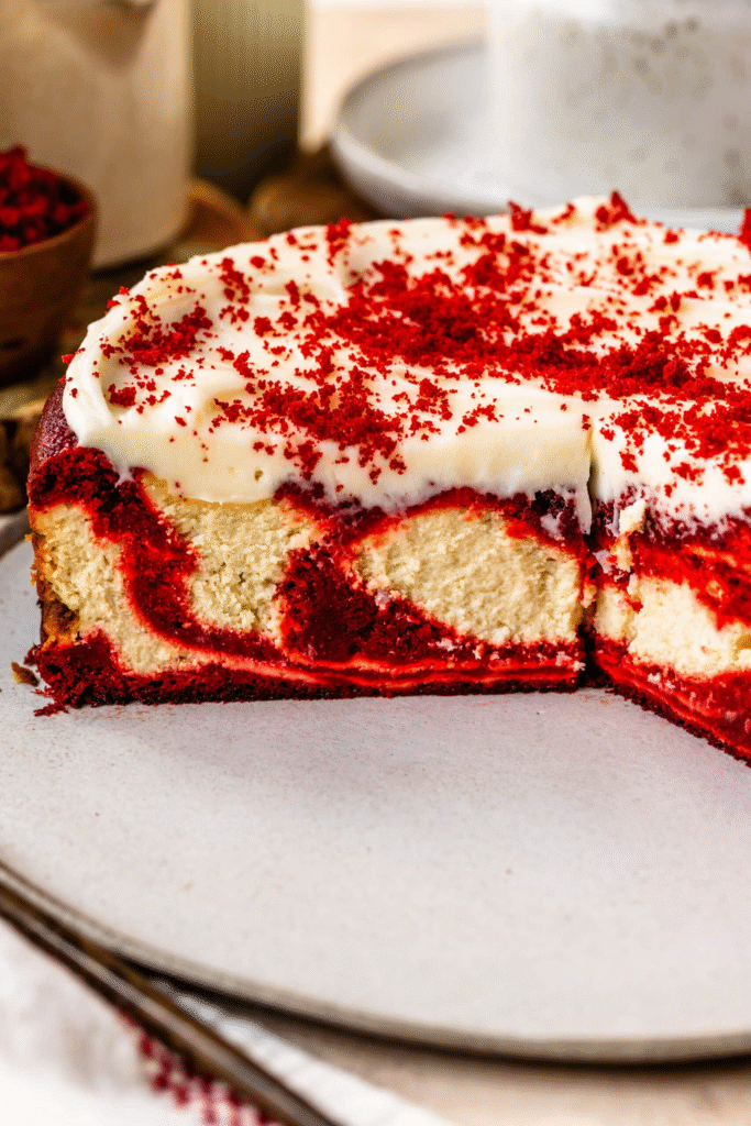 The alternating layers of red velvet cake and cheesecake create a visually stunning and texturally balanced dessert. The vinegar and buttermilk react with baking soda to create a tender crumb, while the rich cheesecake layer provides creamy contrast. Gradual cooling prevents cracking and sinking, ensuring a smooth, bakery-style finish.