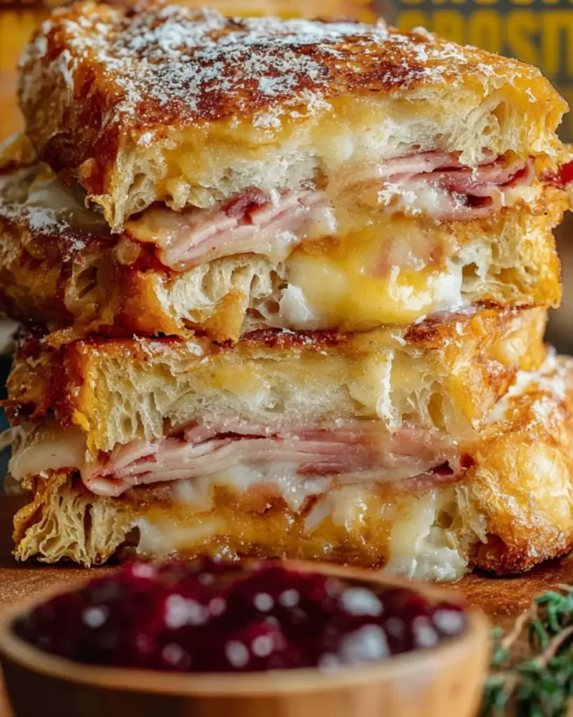 Savory Monte Cristo Sandwich represents American diner cuisine at its most playful and indulgent, taking familiar ingredients and combining them in unexpected ways to create something that transcends the sum of its parts. The quick 20-minute preparation makes this more accessible than you might expect for such an impressive result, while the straightforward technique proves that restaurant favorites can be successfully recreated at home without professional training. This sandwich demonstrates that sweet and savory combinations—often viewed with suspicion—can create harmonious, crave-worthy dishes when balanced thoughtfully. Whether you’re looking for special weekend brunch options that feel celebratory, wanting to recreate beloved diner classics at home, seeking unique sandwiches that go beyond ordinary lunch fare, or simply curious about the famous Monte Cristo that’s appeared on restaurant menus for decades, this classic recipe delivers authentic flavors and textures while adapting easily to personal preferences and dietary needs. Every bite offers that perfect moment where crispy, golden coating gives way to melted cheese and savory meats, finished with sweet powdered sugar and tangy jam in delicious, indulgent harmony that explains why this unusual sandwich has remained an American favorite for generations.