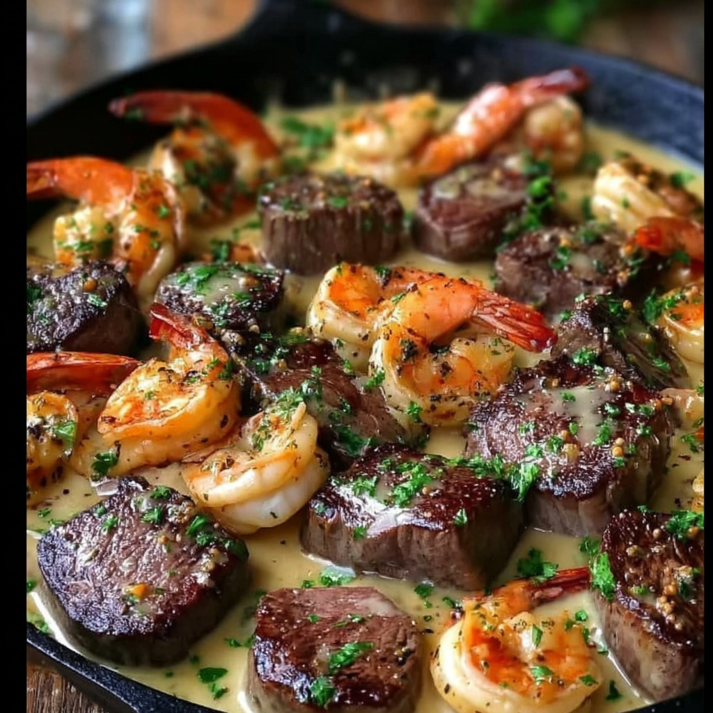 This Steak and Seafood Skillet combines pan-seared ribeye steak with jumbo shrimp in a creamy garlic Parmesan sauce with spinach for a surf-and-turf dinner. The recipe creates a restaurant-style dish by searing steak and shrimp separately, building a cream sauce in the same skillet, then returning proteins to coat with sauce. The technique involves proper high-heat searing followed by sauce construction using pan drippings.